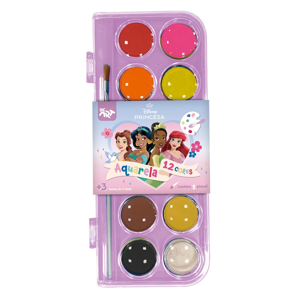 Tags: Aquarela, 12 cores, pincel, Princesas, Dac, material escolar, pintura, arte, kit de pintura, crianças, criatividade, atividades artísticas, diversão, presente.